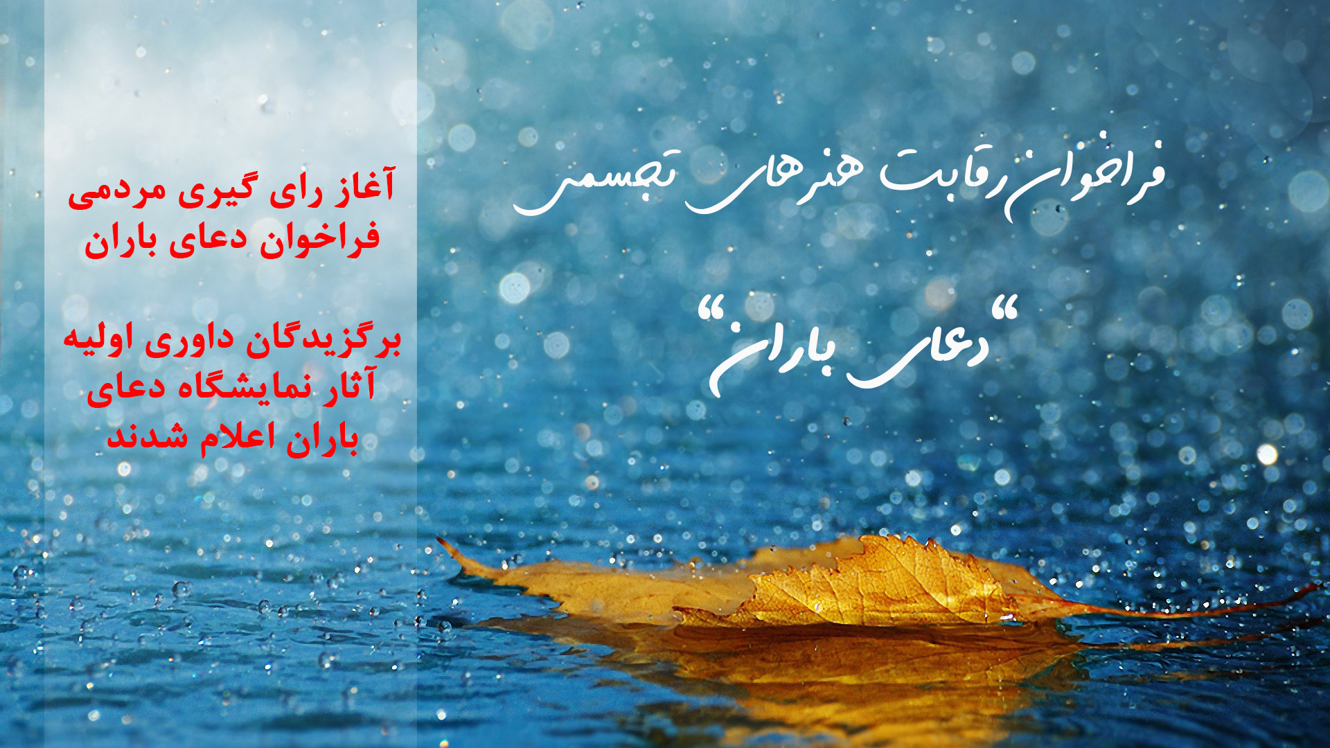 فراخوان دعاي باران، با هدف آگاهي سازي در مورد خطرات کمبود آب و مسائل زيست محيطي و با رويکردهاي آگاهي سازي جامعه در مصرف بهينه آب، راهکارهاي مقابله با کم آبي و تاثيرات خشکسالي بر زندگي ما و محيط زيست برگزار شد.
