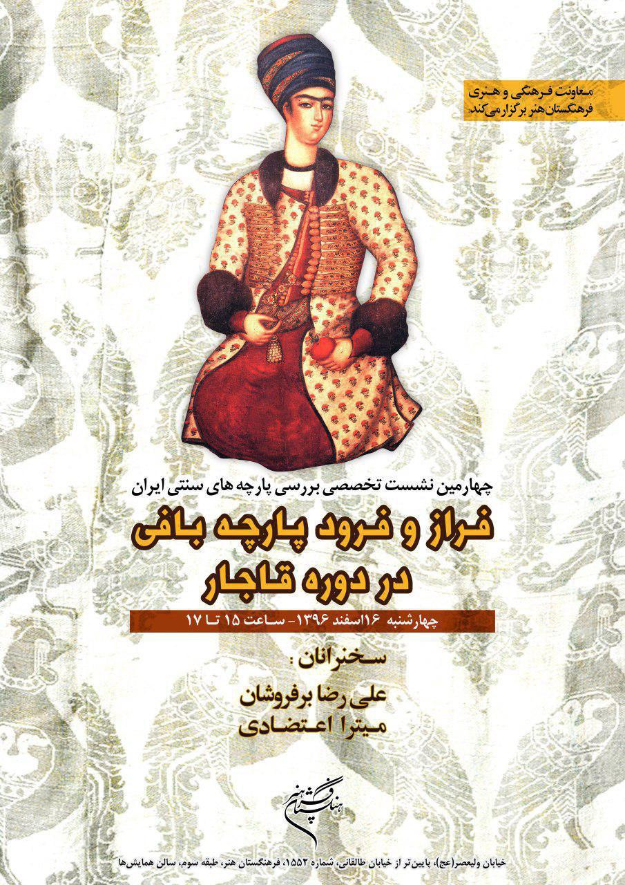 چهارمين نشست تخصصي بررسي پارچههاي سنتي ايران، با موضوع «فراز و فرود پارچهبافي در دورۀ قاجار» برگزار ميشود.