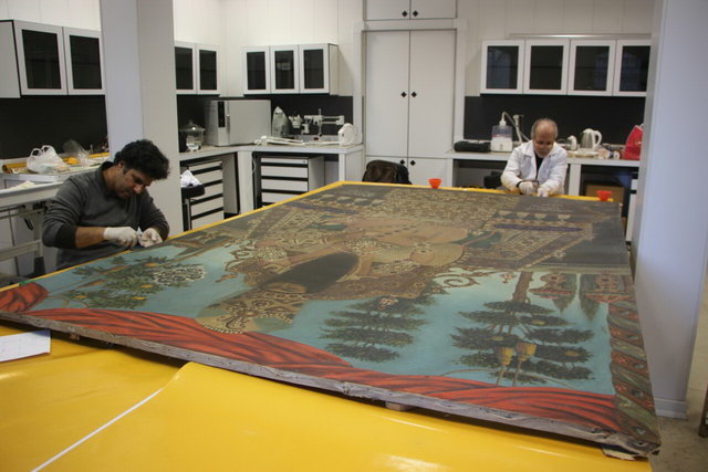 از اواسط بهمن امسال تعدادي از اين تابلوها شامل سه قطعه تابلوي بزرگ "صف سلام فتحعلي شاه "با ابعادي حدود ۳۷ متر که در نوع خود يکي از بزرگترين تابلوهاي نقاشي دنيا محسوب ميشود، سه تابلوي روي بوم کوچکتر از آثار کمالالملک و مصورالممالک و دو تابلوي طراحيهاي ناصرالدين شاه با هدف آمادهسازي براي نمايش در اين نمايشگاه، با همکاري پژوهشکده حفاظت ومرمت آثار تاريخي –فرهنگي پژوهشگاه ميراث فرهنگي و گردشگري مرمت و آمادهسازي ميشوند.