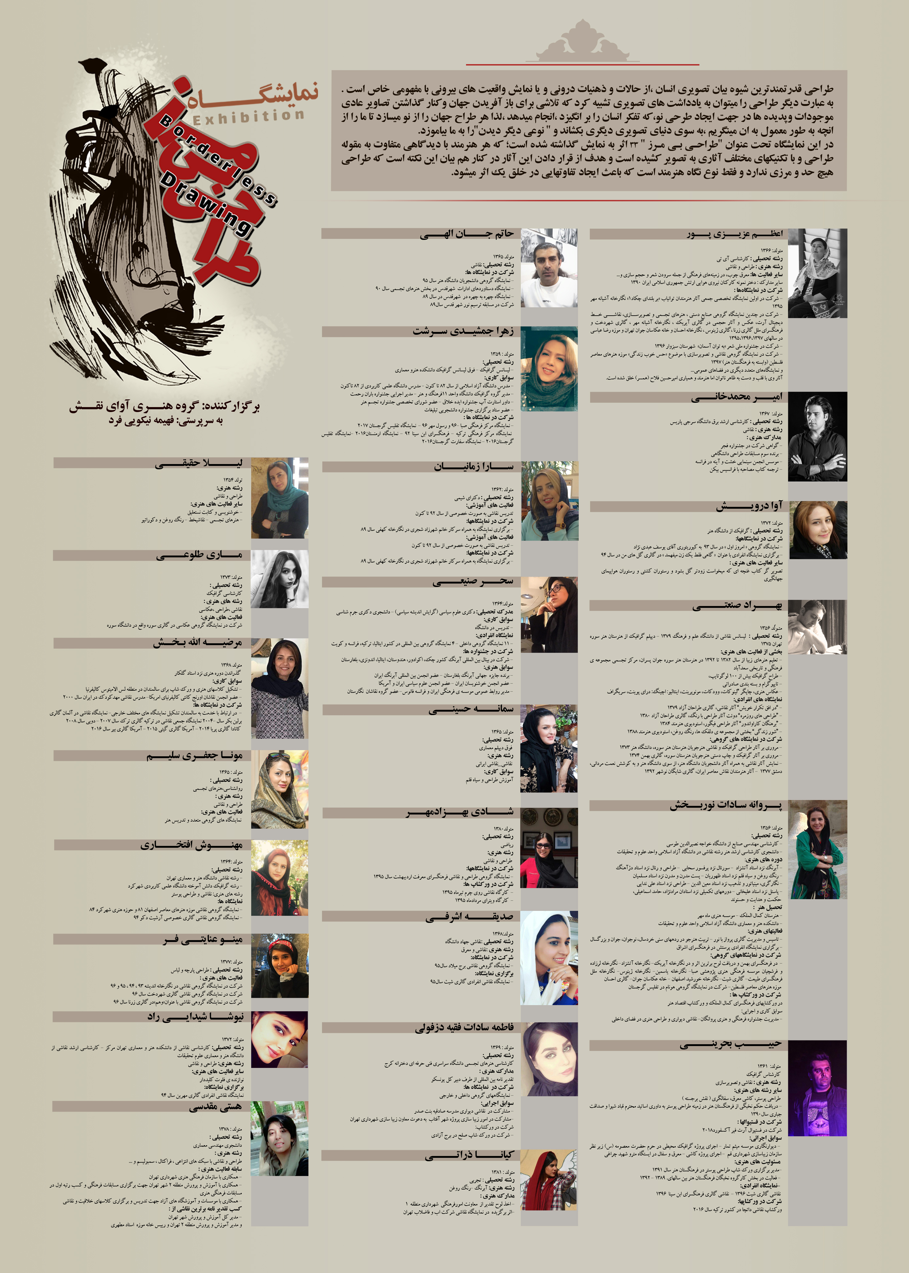 در اين نمايشگاه تحت عنوان "طراحي بي مرز " 33 اثر به نمايش گذاشته شده است; که هر هنرمند با ديدگاهي متفاوت به مقوله طراحي و با تکنيکهاي مختلف آثاري به تصوير کشيده است و هدف از قرار دادن اين آثار در کنار هم بيان اين نکته است که طراحي هيچ حد و مرزي ندارد و فقط نوع نگاه هنرمند است که باعث ايجاد تفاوتهايي در خلق يک اثر ميشود.