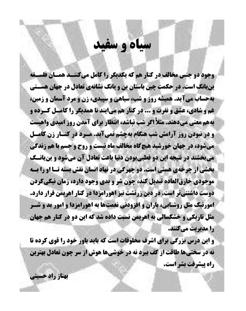 وي در پاسخ به سوالي مبني بر دليل انتخاب اين عنوان و مفهوم آن براي اين مجموعه توضيح داد: اين عنوان به نام سياه و سفيد است که نشان دهنده ي تعادل در جهان هستيست يعني اگر بدي وجود دارد خوبي در مقابل آن است و سياه و سفيد کنار هم معني دار ميشود.