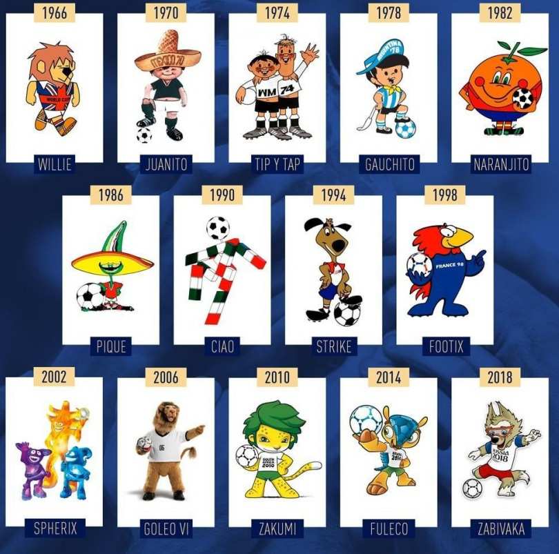 از سال ۱۹۶۶ ميلادي، در هر دوره از جام جهاني فوتبال يک نماد خوشيمن براي مسابقات انتخاب ميشود. «ويلي جام جهاني» نخستين نماد خوشيمن بود که براي جام جهاني فوتبال در انگلستان انتخاب شد. اين نماد نه تنها براي مسابقات جام جهاني براي نخستين بار انتخاب ميشد که از اين نظر در ديگر رشتههاي ورزشي نيز حرکتي جديد بود. در طراحي نماد خوشيمني از خصوصيات کشور ميزبان (نظير لباس و فرهنگ، بافت جانوري و گياهي و…) استفاده ميشود.