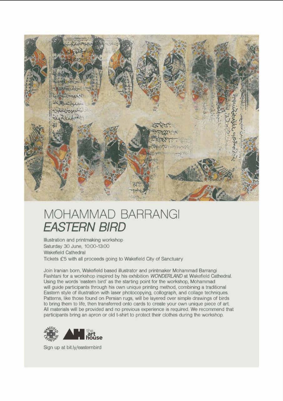 به گزارش گالري آنلاين، براي شرکت در ورکشاپي که از نمايشگاه سرزمين عجايب وي در کليساي جامع ويکفيلد الهام گرفته شده، وي از کلمه ي " پرنده ي شرقي" به عنوان نقطه ي شروعي براي ورکشاپ استفاده کرده است. محمد بررنگي شرکت کننده ها را راهنمايي ميکند تا کارت هنري خاص خودشان را با استفاده از روش خاص خودش که ترکيب شده با روش سنتي شرقي از تصويرسازي، فتوکپي ليزري، خوشنويسي و تکنيکهاي کلاژ و الگوهايي که از قالي هاي ايراني الهام گرفته شده، خلق کنند. اين ورکشاپ در روز شنبه ۳۰ جون برگزار شده است.