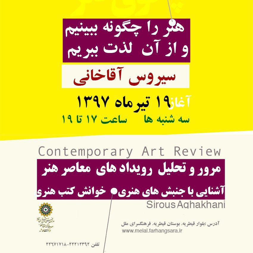 برنامه اي تحت عنوان "هنر را چگونه ببينيم و از آن لذت ببريم با سخنراني سيروس آقاخاني برگزار مي شود.