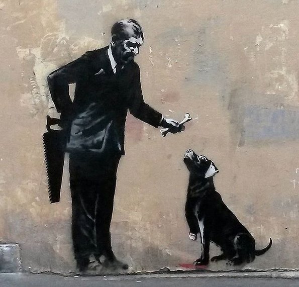 يکي از بحث برانگيزترين نقاشيهاي خياباني «بنکسي» در پاريس در نزديکي دانشگاه سوربون کشيده شده و مردي را نشان ميدهد که با يک دستش يک اره دستي را پشت خود پنهان کرده و با دست ديگر در حال دادن استخوان به سگي است که بخشي از پاي جلوي آن قطع شده است.
