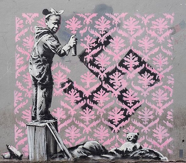 يکي از اين نقاشيها در خياباني در بخش شمالي پاريس ايجاد شده و جايي قرار دارد که معمولا مهاجران به شکل نامناسبي ميخوابند. اين نقاشي دختر سياهپوستي را نشان مي دهد که در حال کشيدن طرحهايي با اسپري صورتي بر روي نشان نازيها (سواستيکا) است.