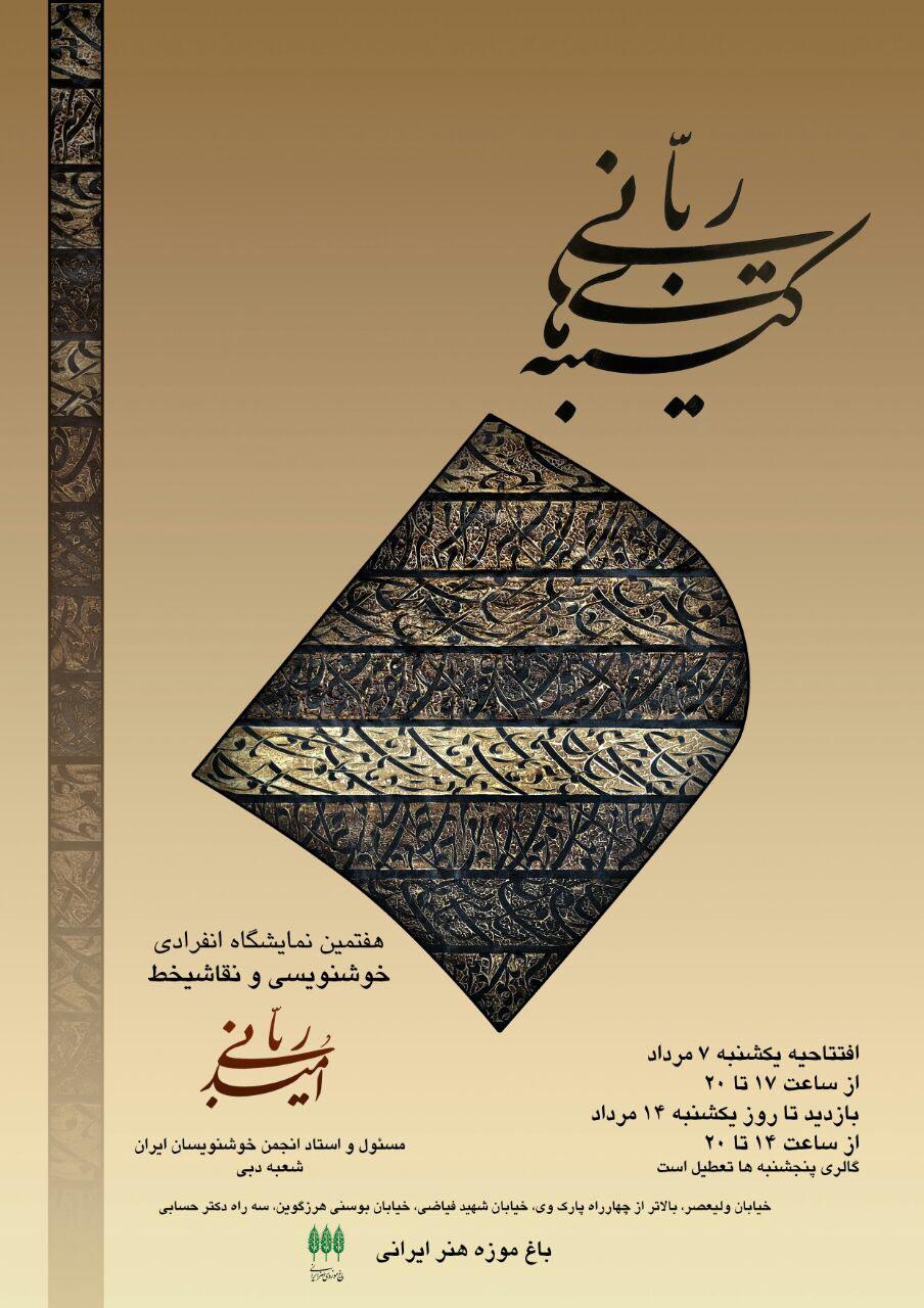 آيين گشايش هفتمين نمايشگاه آثار خوشنويسي و نقاشيخط اميد رباني با عنوان «کتيبه هاي رباني» روز يکشنبه هفتم مردادماه در باغ موزه هنر ايراني برگزار مي شود.