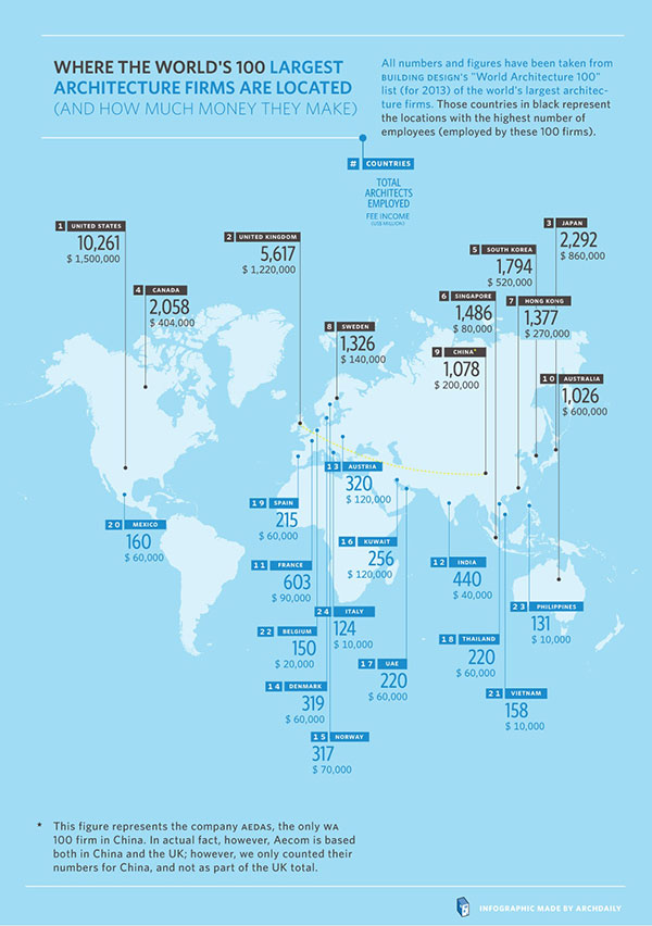 در ميان بزرگ‌ترين شرکت‌هاي معماري، AECOM با 1370 کارمند در سراسر دنيا در رتبه اول و کمپاني گنسلر با 1346 کارمند و IBI با 1129 نفر در رتبه‌هايي بعدي قرار دارند.