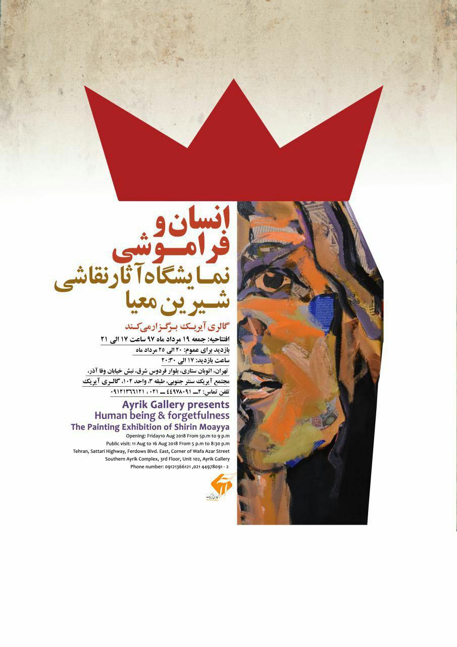 گالري آيريک از روز جمعه 19 مردادماه از ساعت 17 الي 21 ميزبان نقاشي هاي شيرين معيا تحت عنوان "انسان و فراموشي" مي شود.