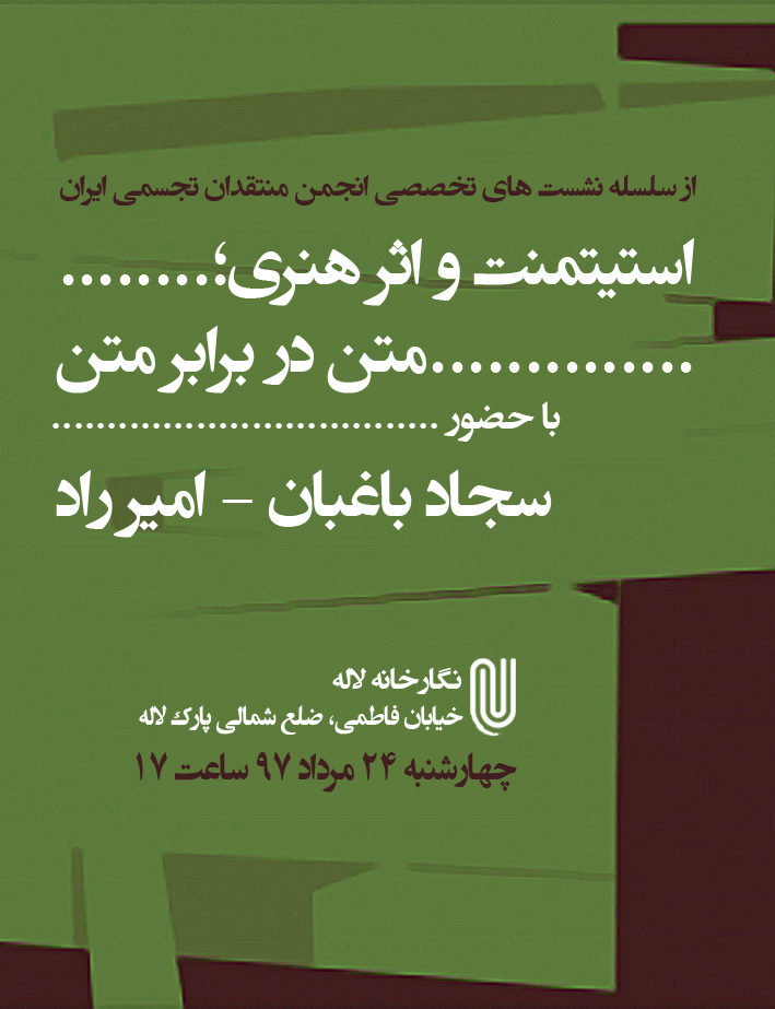 سومين برنامه از سلسله نشست هاي تخصصي منتقدان تجسمي با موضوع بيانيههاي هنري در نگارخانه لاله برگزار مي شود. در اين برنامه که با حضور سجاد باغبان و امير راد برگزار مي شود، موارد زير بررسي و پيرامون آن گفتگو خواهد شد: