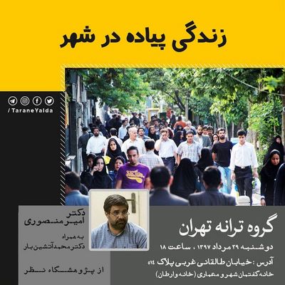 با حمايت گروه ترانه تهران، نشستي با عنوان "زندگي پياده در شهر" در خانه گفتمان شهر و معماري برگزار ميشود.