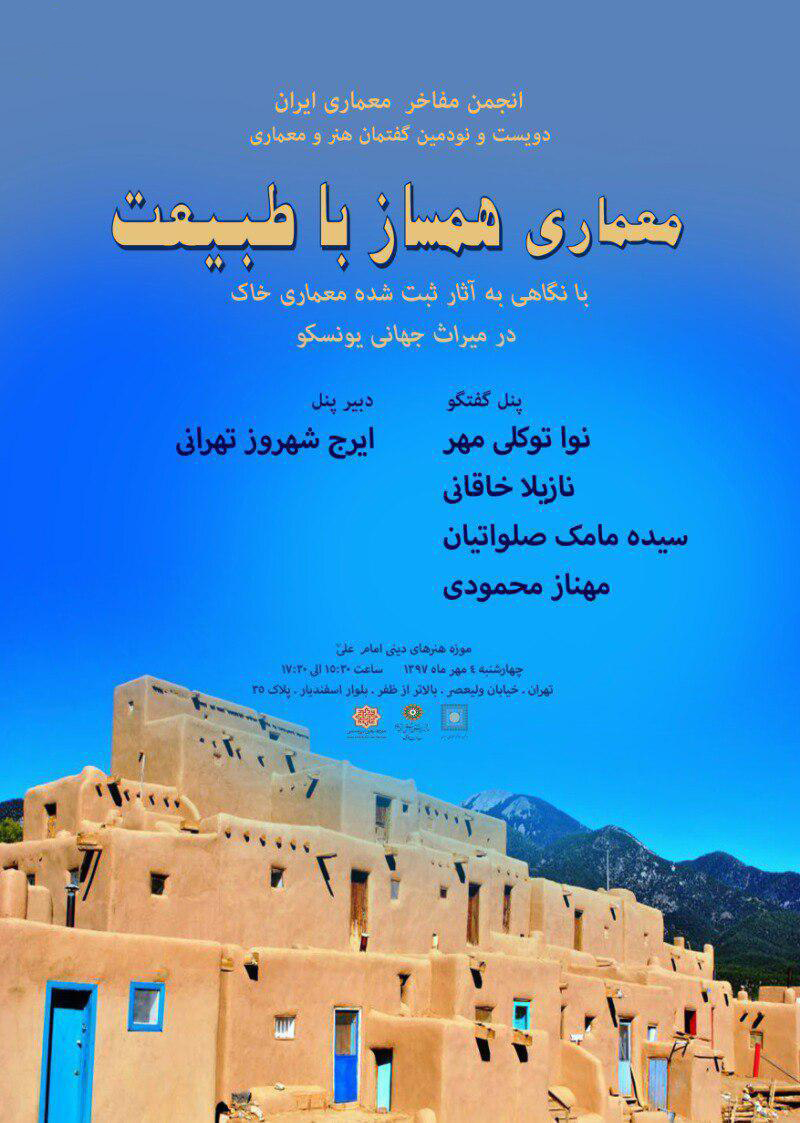 به گزارش گالري آنلاين به نقل از روابط عمومي انجمن مفاخري معماري ايران، در دويست و نودمين گفتمان هنر و معماري که به معرفي مشخصه هاي موثر خاک براي کاربرد در ساخت و ساز امروزي و قابليت هاي آن براي بکارگيري در ساخت سر پناه موقت و اضطراري در شرايط وقوع بحران هاي طبيعي و انساني و يا در مناطق دور از مراکز شهري مي پردازد، مهندس نوا توکلي مهر، دکتر نازيلا خاقاني، دکتر سيده مامک صلواتيان و دکتر مهناز محمودي سخن خواهند گفت که با نمايش فيلم همراه است و دبير پنل گفتگو دکتر ايرج شهروز تهراني است.