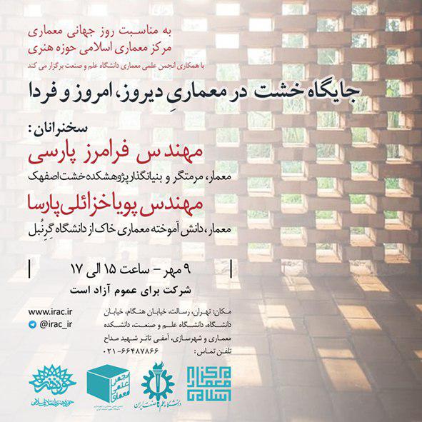 به گزارش گالري آنلاين به نقل از روابط عمومي مرکز معماري اسلامي، سخنرانان اين برنامه مهندس فرامز پارسي (معمار، مرمتگر و بنيانگذار پژوهشکده خشت در روستاي اصفهک) و مهندس پويا خزائلي پارسا (معمار و دانشآموخته معماري خاک از دانشگاه گِرِنُبل) هستند و شرکت براي عموم آزاد و رايگان است.