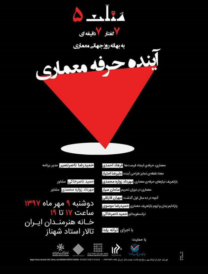 برنامه پنجم از سري برنامه هاي مثلث، به بهانه روز جهاني معمار با 7 گفتار 7 دقيقه اي تحت عنوان "آينده حرفه معماري" در خانه هنرمندان برگزار مي شود.