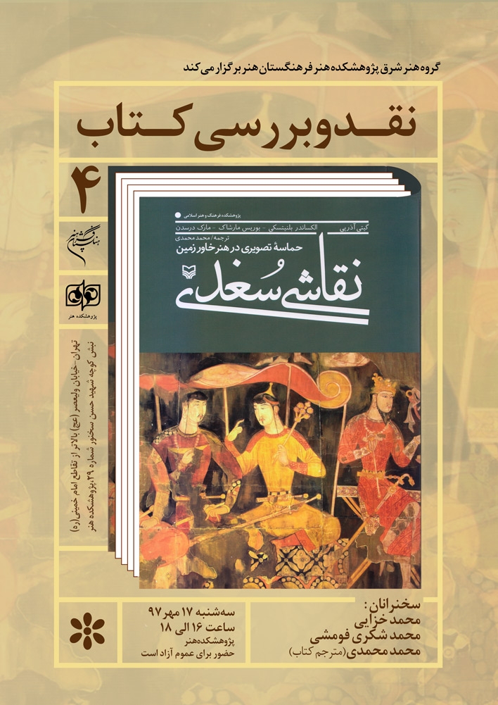 چهارمين نشست از «سلسله نشست‌هاي نقد و بررسي كتاب‌هاي هنر شرق» با عنوان «نقد و بررسي کتاب نقاشي سُغدي» سه‌شنبه ۱۷ مهر در پژوهشكده هنر برگزار مي‌شود.