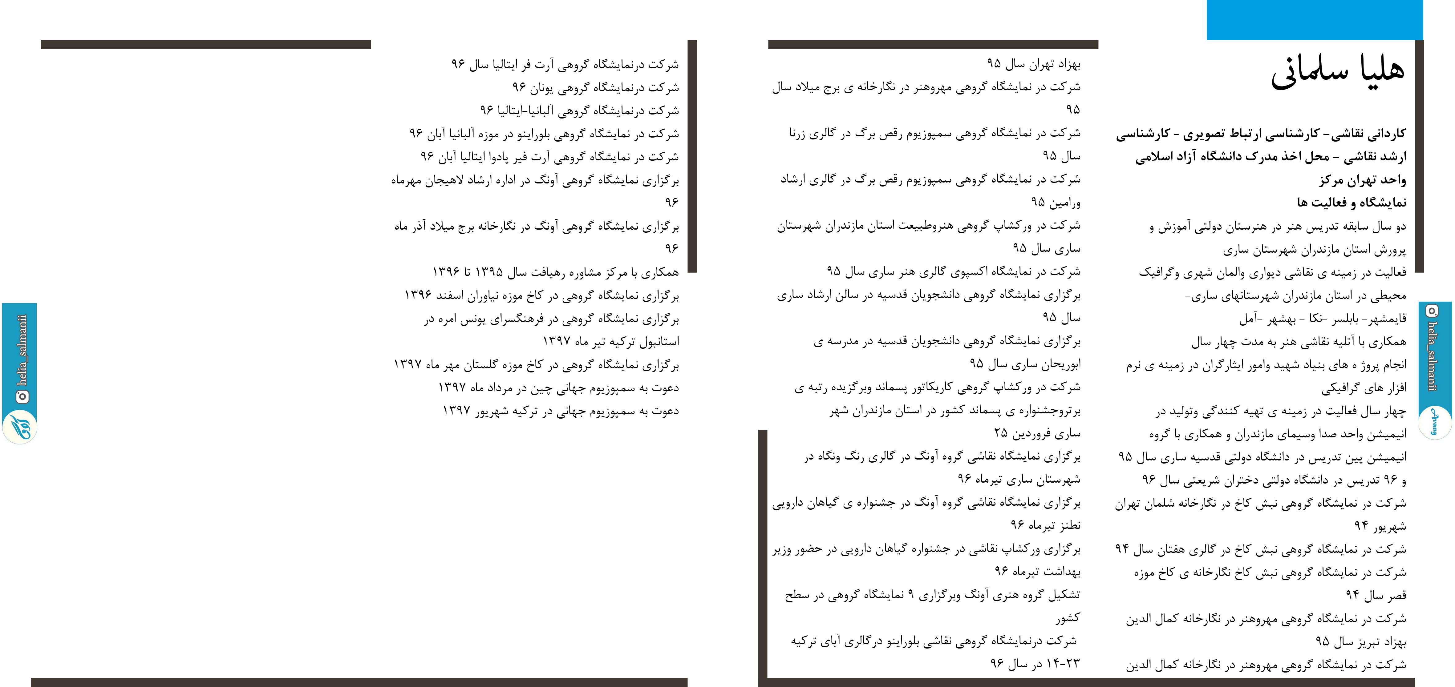 هليا سلماني کيوريتور نمايشگاه و مدير گروه آونگ برگزاري بيش از بيست نمايشگاه گروهي در سطح داخلي و خارج از ايران را همراه اين گروه داشته است همواره در تلاش بر اين بود تا بتواند به دانشجويانش و هنرمندان توانا و گمنام سراسر نقاط ايران دست ياري برساند و در نقاط مختلف كشور نمايشگاه هايي را به همين عنوان برگزار كرده است، و در نتيجه حمايت هاي هنري و فرهنگي و برند سازي جوانان پيشرو و آونگارد در هنرهاي تجسمي از جمله نقاشي، تصوير سازي، مجسمه، عكاسي و غيره ميباشد.