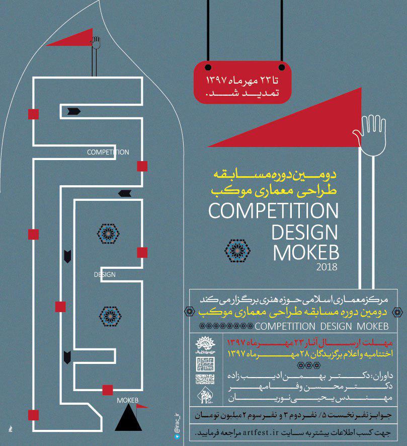 فراخوان دومين مسابقه طراحي معماري موکب که توسط موسسه فرهنگي هنري سپهر سوره هنر و با همکاري مرکز معماري اسلامي حوزه هنري مهر ماه امسال برگزار مي شود، با توجه به استقبال گسترده و درخواست‌هاي مکرر نسبت به تمديد مهلت مسابقه، تا پايان وقت اداري دوشنبه 23 مهرماه تمديد گرديد.