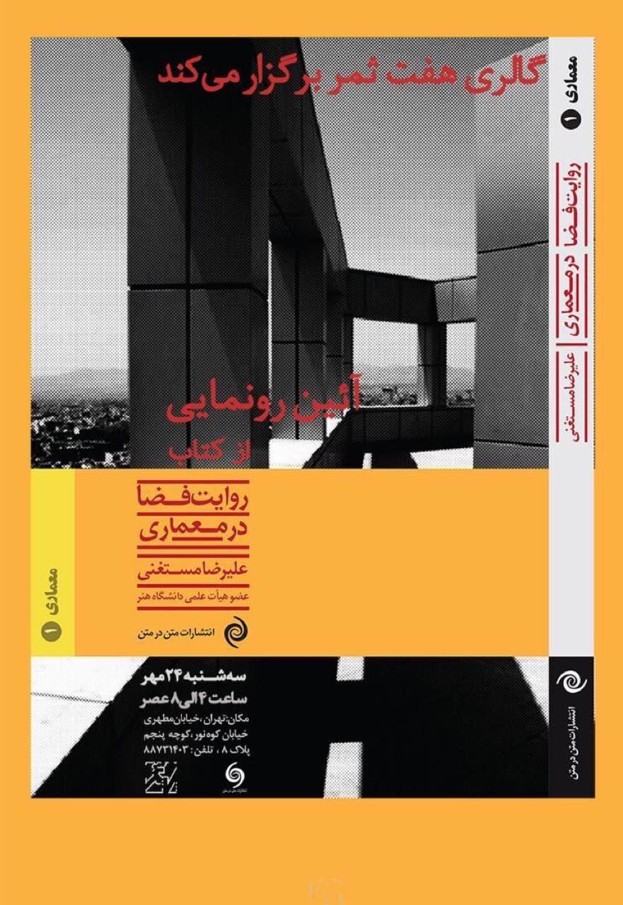 آئين رونمايي از کتاب "روايت فضا در معماري" نوشته عليرضا مستغني عضو هيئت علمي دانشگاه هنر سه شنبه 24 مهرماه در گالري هفت ثمر برگزار مي شود.