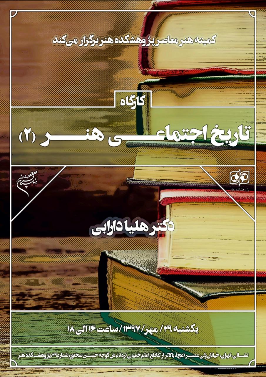 دومين دوره «كارگاه تاريخ اجتماعي هنر» طي يك جلسه روز يكشنبه ۲۹ مهر ساعت ۱۶ تا ۱۸ در پژوهشكده هنر به نشاني خيابان ولي عصر، بالاتر از خيابان امام خميني، كوچه شهيد حسن سخنور، پلاك ۲۹ برگزار ميشود.