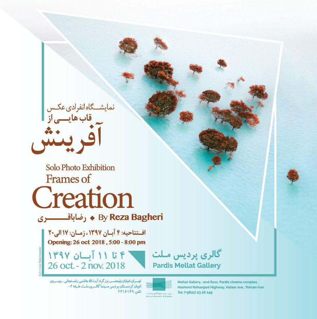 نمايشگاه انفرادي عکس رضا باقري با عنوان «قاب هايي از آفرينش» با ۲۰ اثر جمعه ۴ ام آبان ماه ساعت ۱۷ الي ۲۰ در محل گالري پرديس ملت با حضور اساتيد، مجموعه داران، دوست داران هنر و هنرمندان افتتاح مي شود.