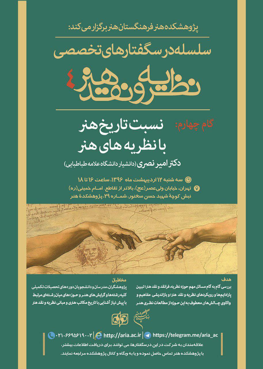 پژوهشكده هنر چهارمين نشست از «سلسله درسگفتارهاي تخصصي نظريه و نقد هنر» را با عنوان «نسبت تاريخ هنر با نظريههاي هنر» روز سهشنبه ۱۲ ارديبهشت برگزار ميكند.