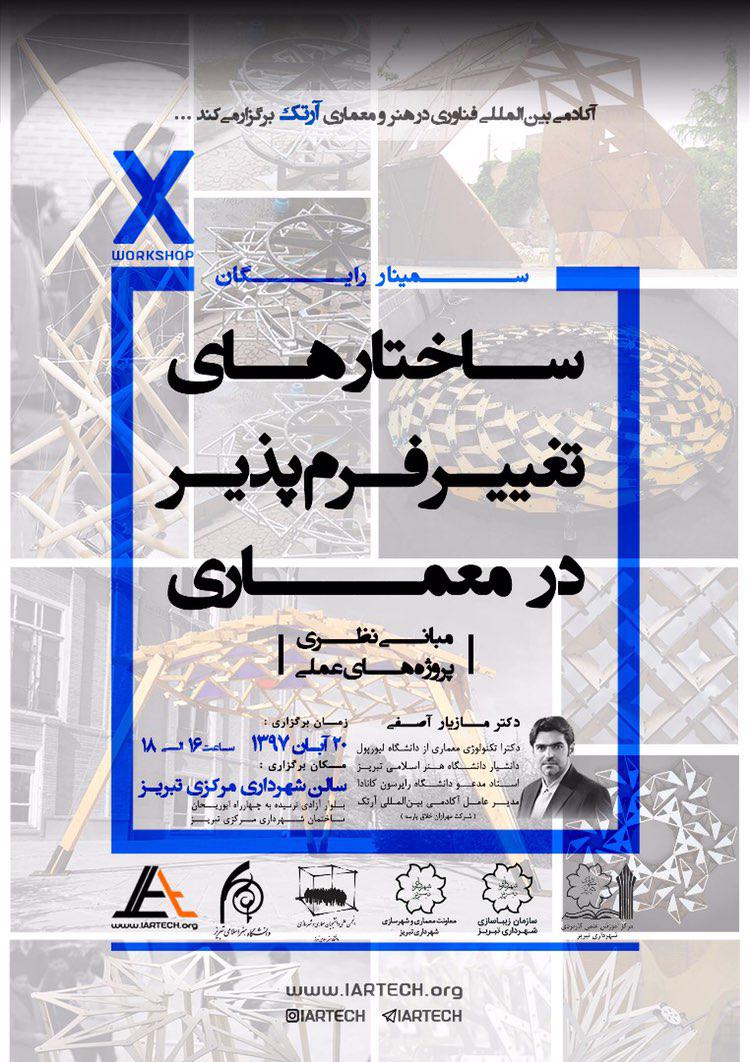 آکادمي بين المللي فناوري در هنر و معماري آرتک سمينار رايگان "ساختارهاي تغييرفرم پذير در معماري" را 20 آبان ماه در شهرداري مرکزي تبريز برگزار مي کند.
