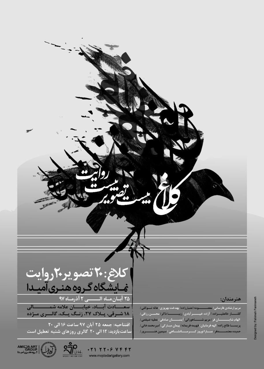 گالري مژده از روز جمعه 25 آبان ماه ميزبان نمايشگاه گروه هنري آميدا تحت عنوان "کلاغ: بيست تصوير بيست روايت" مي شود.