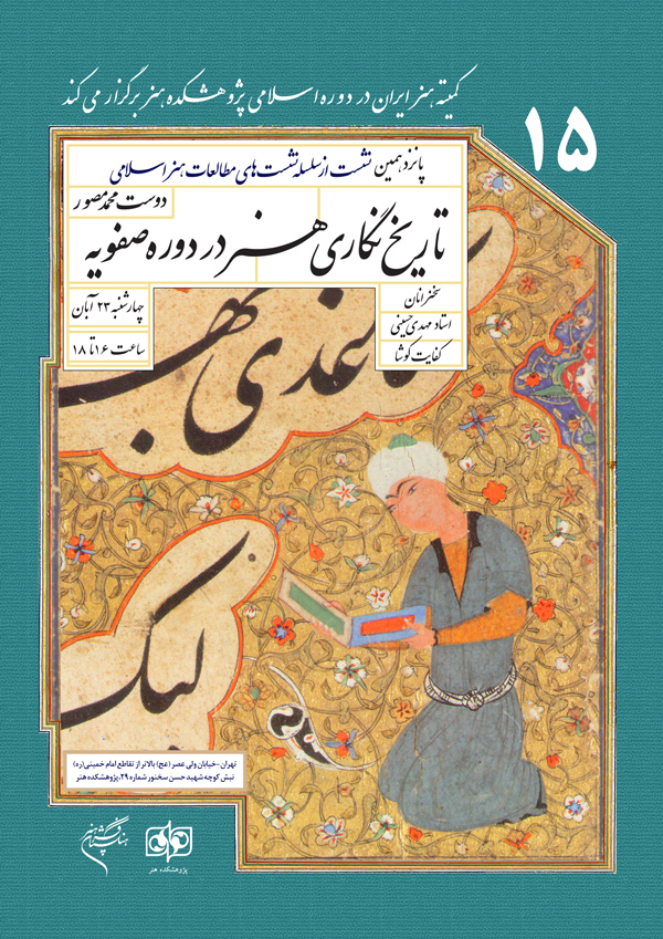 پانزدهمين نشست از «سلسله نشستهاي مطالعات هنر اسلامي» با عنوان «تاريخ نگاري هنر در دوره صفويه؛ دوست محمد مصور» در پژوهشكده هنر برگزار ميشود.
