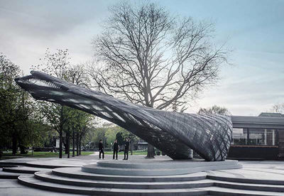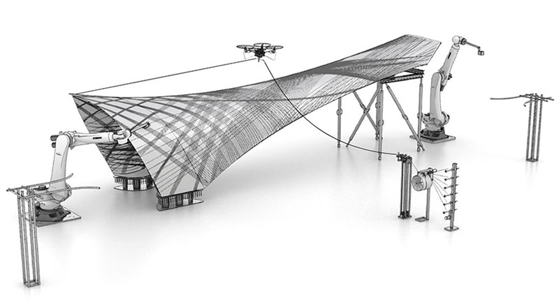 سازه اي که اين گروه امسال به نمايش گذاشتهاند، بر اساس ويژگيهاي بيوليژيکي پروانه معدنچي و لارو کرم ابريشم ساخته شده است. در اين روش نحوه اتصال تارهاي پيله اين نوع پروانه مشاهده شده که چگونه تارهاي پيله را به شاخ و برگ درخت پيوند مي زند. يک راه حل کاملاً طبيعي در محيط زيست که الهام بخش ساخت اين سازه معماري شده است. اما ويژگي منحصربه فرد اين پاويون نحوه اجراي آن توسط نيروي الکترونيکي و به وسيله ربات و پهپاد است.