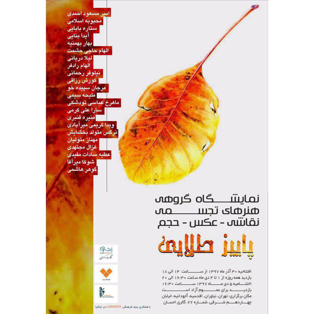 نمايشگاه "پاييز طلايي" تا پنجم دي ماه در گالري احسان به نشاني نياوران، اقدسيه، آجودانيه، خيابان چهاردهم شرقي، شماره 22 ادامه خواهد داشت.