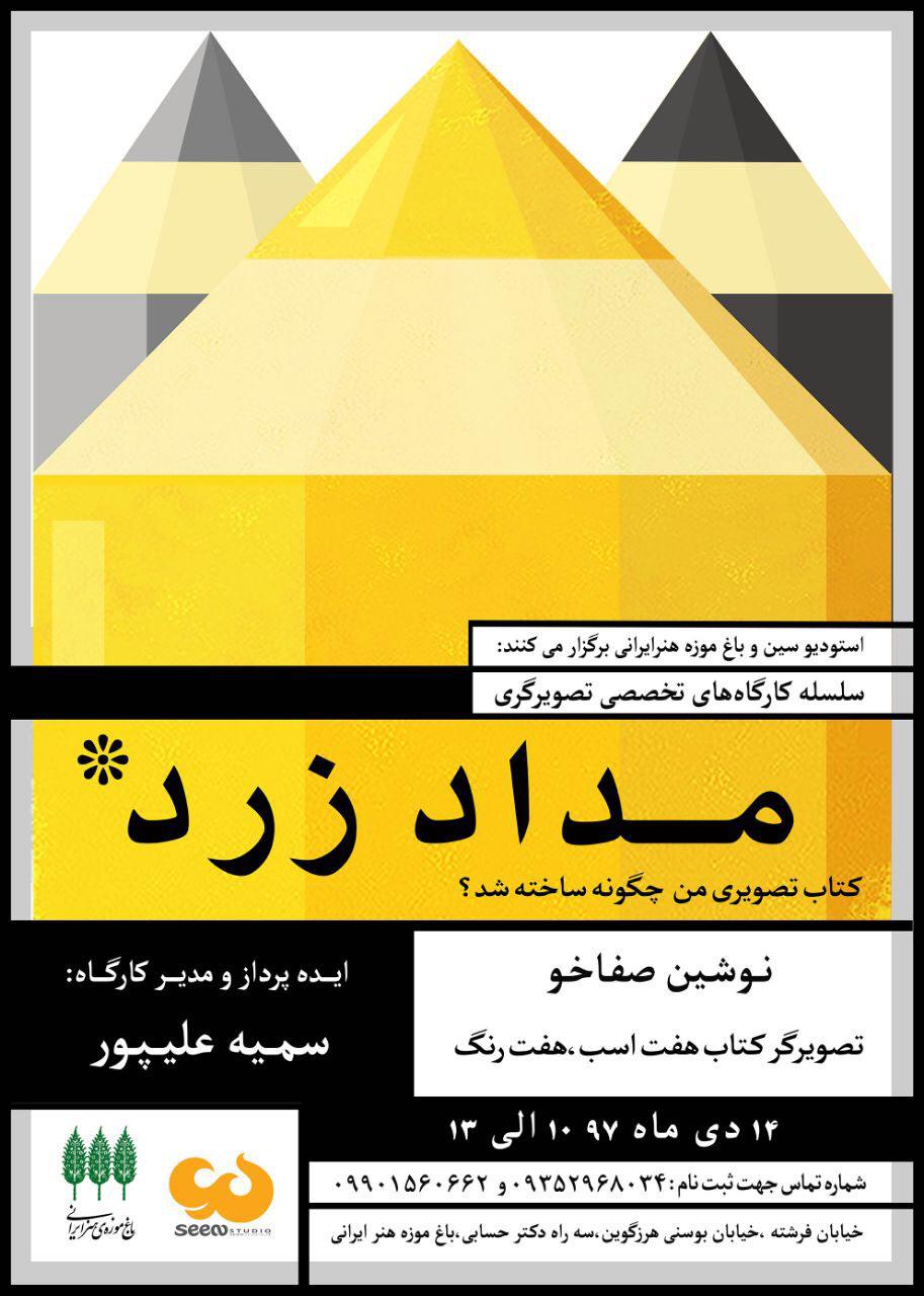 استوديو سين در ادامه روند برپايي کارگاههاي تخصصي تصويرگري که در چند سال اخير برگزار نموده است، سلسله کارگاههاي "مداد زرد" چگونه کتاب تصوير من ساخته شد؟ را با همکاري باغ موزه هنر ايراني برگزار مي نمايد.