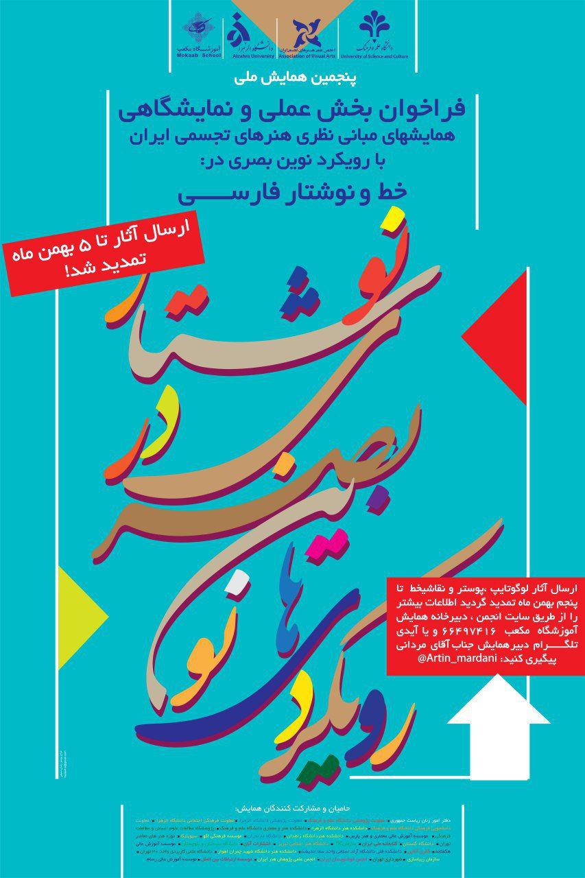 باتوجه به استقبال زياد و تقاضاي مکرر شرکت کنندگان در بخش عملي همايش هاي انجمن علمي هنرهاي تجسمي ايران ،مهلت ارسال آثار بخش نوشتار (لوگوتايپ، پوستر، و نقاشيخط ) تا پنجم بهمن ماه تمديد گرديد.
