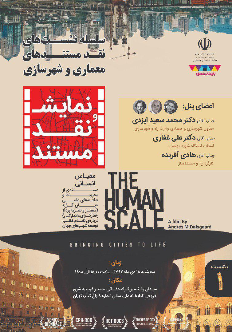 به گزارش گالري آنلاين، اين نشست با حضور دکتر محمد سعيد ايزدي (معاون شهرسازي و معماري وزارت راه و شهرسازي)، دکتر علي غفاري (استاد دانشگاه شهيد بهشتي) و هادي آفريده (کارگردان و مستندساز) همراه با نمايش مستند "مقياس انساني"، مستندي از تجربيات و يافته هاي علمي "يان گل" (معمار و نظريه پرداز رفتارگراي دانمارکي) درباره ي نظام غالب توسعه شهرهاي جهان از ساعت 15 الي 18 برگزار مي شود.