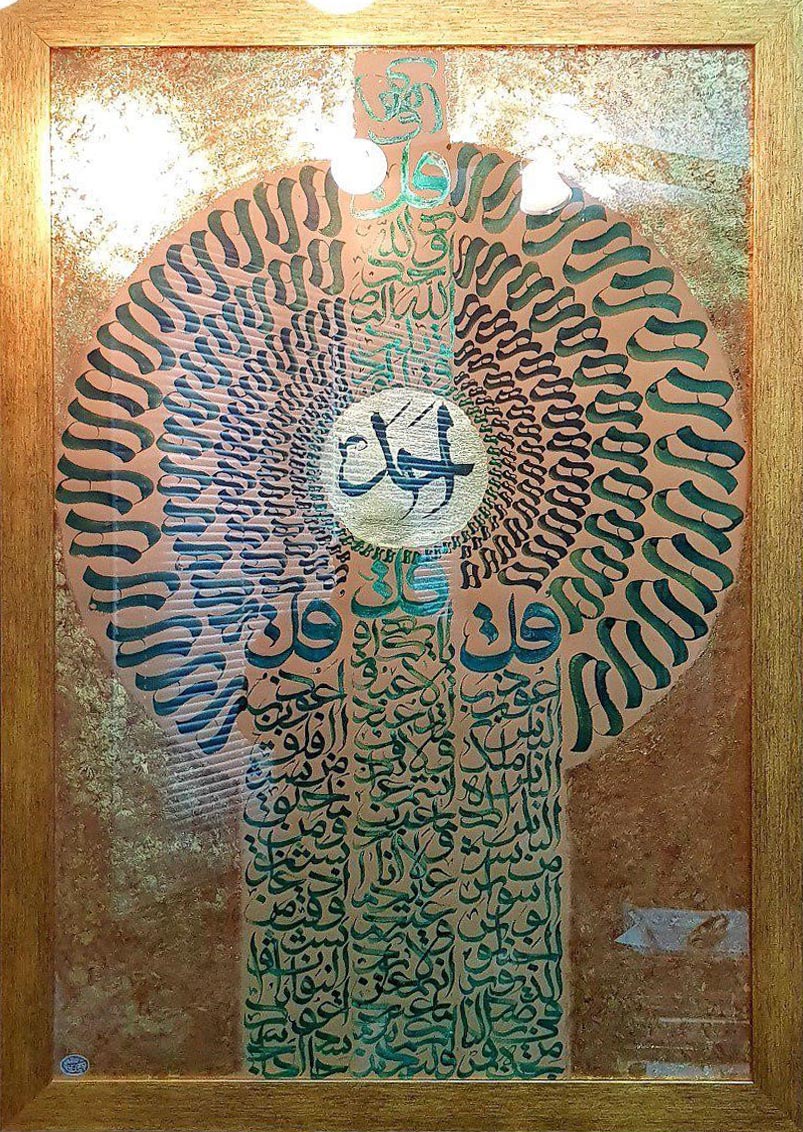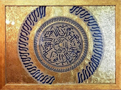 سبک هنري او خط نقاشي – کاليگرافي – ورق طلا – ميکس مديا – آبستره – مرکب و قلم است.