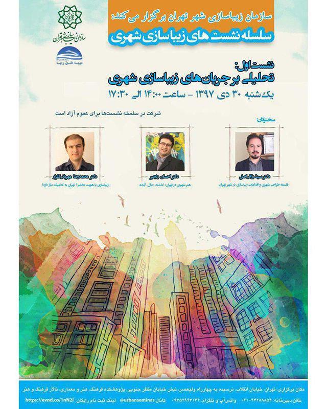 به گزارش گالري آنلاين به نقل از روابط عمومي و اموربين الملل سازمان زيباسازي شهر تهران، اين نشست با موضوع "تحليلي برجريانهاي زيباسازي شهري" با سخنراني دکتر سينا رزاقي اصل (عضو هيئت علمي دانشگاه شهيد رجايي)، دکتر احسان رنجبر (عضو هيئت علمي دانشگاه تربيت مدرس ) و دکتر محمدرضا مهرباني گلزار (عضو هيئت علمي دانشگاه بين المللي امام خميني قزوين) ز ساعت 14 الي 17:30 برگزار مي شود؛ که هدف از برگزاري آن تحقيق و توسعه نوين، فرهنگ زيباسازي و الگوسازي صحيح است و در اولين نشست خود به تحليل جريانهاي زيباسازي شهري ميپردازد.