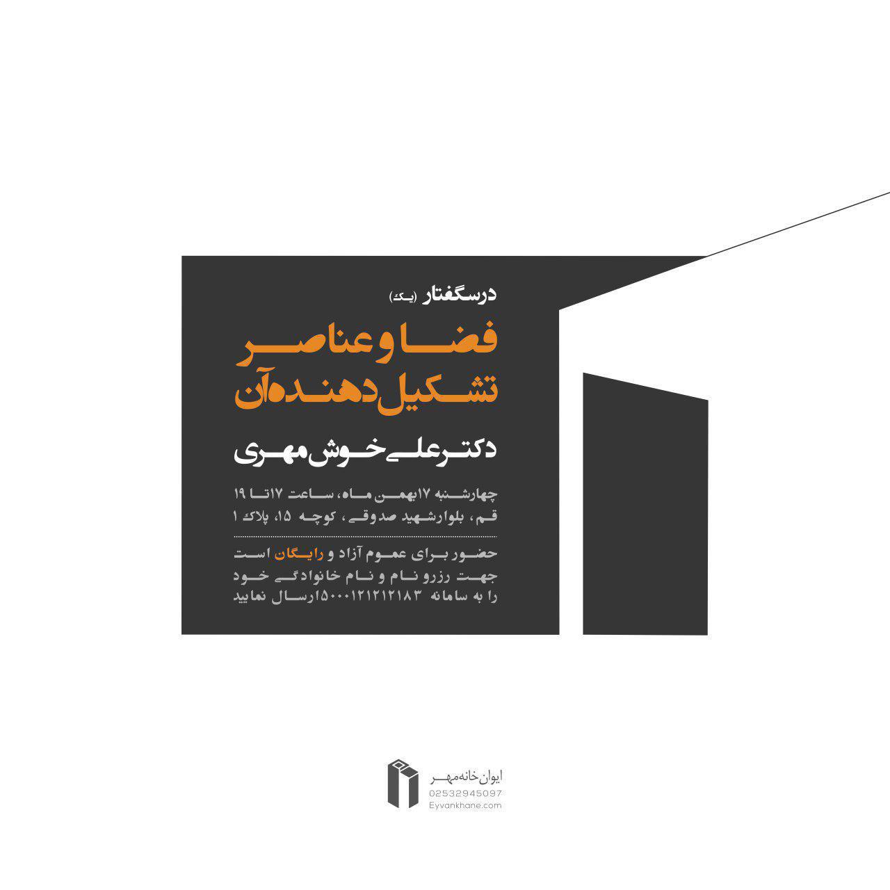 مدرسه هنر و معماري ايوان خانه مهر درس گفتار يک با موضوع "فضا و عناصر تشکيل دهنده آن" را برگزار ميکند.