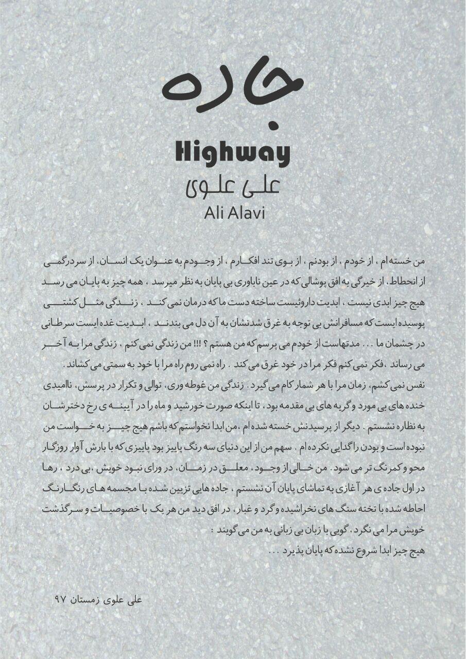 "جاده" عنوان نمايشگاه نقاشي هاي علي علوي است که از روز جمعه 10 اسفندماه در گالري خورشيد برپا مي شود.