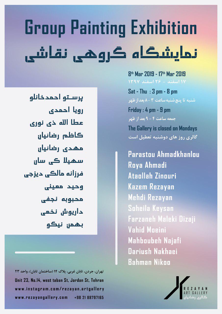 نمايشگاه نقاشي هاي گروهي از هنرمندان از روز جمعه 17 اسفندماه در گالري رضائيان افتتاح مي شود و تا 26 اسفندماه نيز ادامه خواهد داشت.