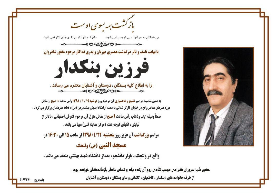 به گزارش گالري آنلاين به نقل از روابط عمومي موزه هنرهاي معاصر تهران، پيکر مرحوم فرزين بنکدار، مرمتگر موزه هنرهاي معاصر ساعت ۱۰ صبح روز دوشنبه (۱۹ فرودين ماه)، از مقابل موزه هنرهاي معاصر واقع در خيابان کارگر شمالي برگزار ميشود.