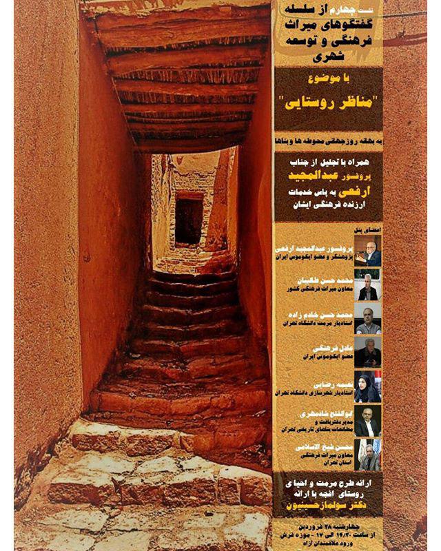 نشست چهارم از سلسله گفتگوهاي ميراث فرهنگي و توسعه شهري با موضوع "مناظر روستايي" به بهانه روز جهاني محوطه ها و بناها همراه با تجليل از پروفسور عبدالمجيد ارفعي برگزار مي شود چهارشنبه ۲۸ فروردين ماه برگزار مي شود.