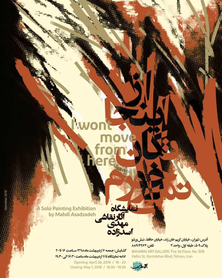 نمايشگاهي از نقاشي هاي مهدي اسد زاده تحت عنوان "از اينجا تکان نمي خورم" از روز جمعه 6 ارديبهشت ماه در گالري بهارين برپا مي شود.
