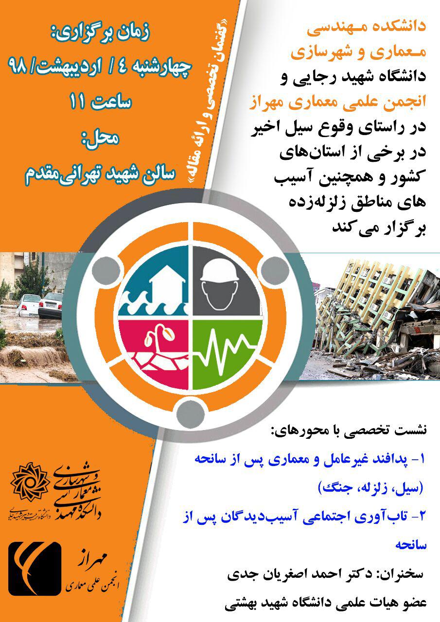 دانشکده مهندسي معماري و شهرسازي دانشگاه شهيد رجايي و انجمن علمي معماري مهراز در راستاي وقوع سيل اخير در برخي از استان هاي کشور و همچنين آسيب هاي مناطق زلزله زده، نشست تخصصي را برگزار مي کند.
