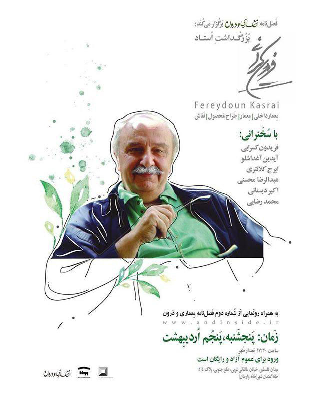 فصلنامه معماري و درون بزرگداشت استاد فريدون کسرايي، معمار، معمار داخلي، طراح محصول و نقاش را پنجشنبه 5 ارديبهشت ماه 98 در خانه وارطان برگزار مي نمايد.