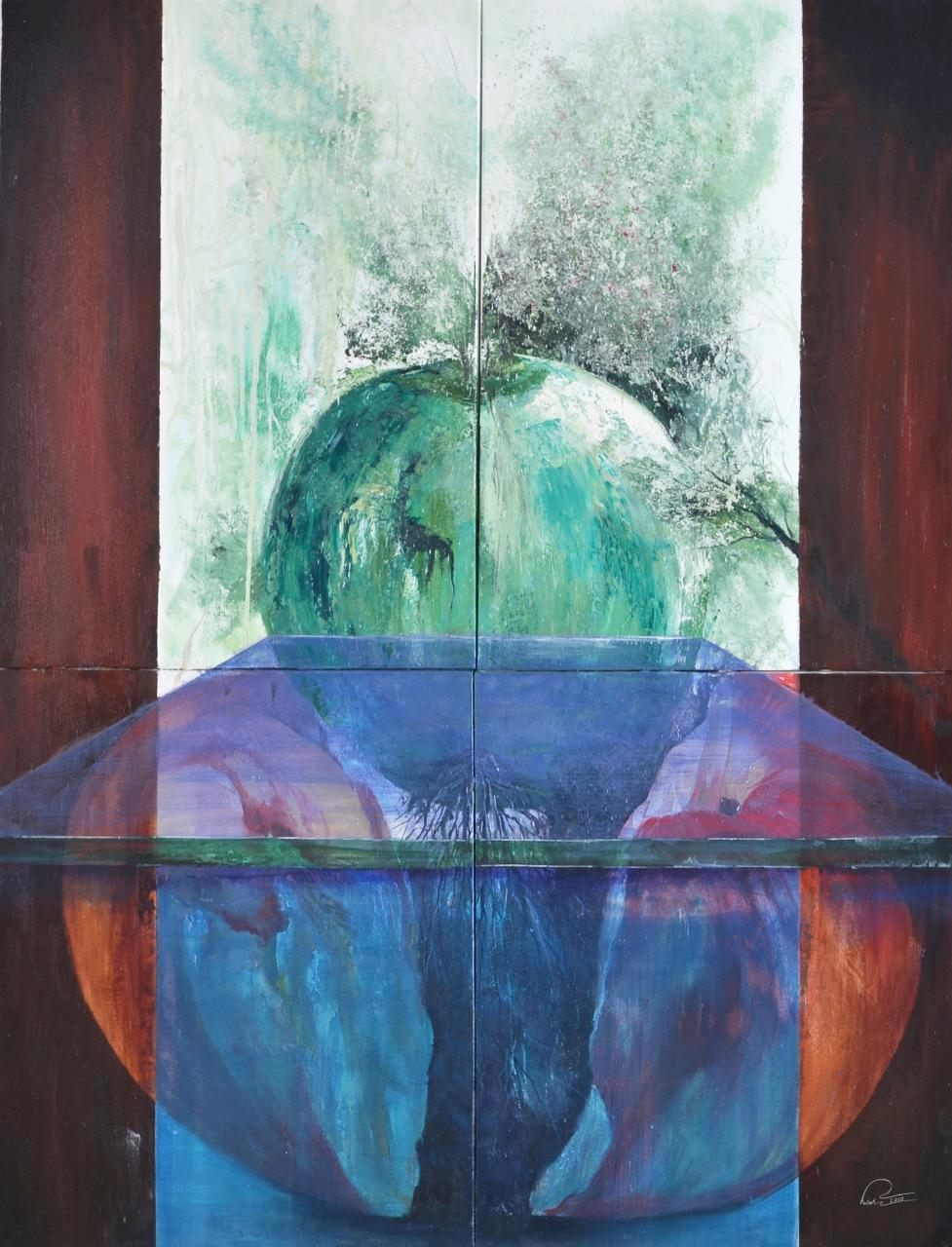 رضا فلاح زاده در اين نمايشگاه از ميان سه مجموعه آثارش، 16 اثر را انتخاب نموده است. در مجموعه نسلها با بيان تمثيلي و استعاره از زايش سيب و درخت ادامه نسل را با استفاده از رنگهاي مکمل، ناهمگوني نسل بعد با نسل قبل را در معرض ديد قرار داده اند. تغييرات و دور شدن تدريجي افکار نسل جديد با نسل گذشته با اجراي تکنيکهاي امتزاج و ترکيب رنگها مستقيما روي بوم و بدون استفاده از پالت و جلوه گري همنشيني رنگها، اختلاف نسل جديد و قديم را به نمايش در مي آورد. در تابلو سرشت از انسانهايي که ريشه در خاک دارند ولي ميوه درخت که صورت دو انسان را نشان مي دهد با اختلاف رنگها، منش بد و خوب انسانها را نشان داده است. در کليه آثار عليرغم عدم حضور انسان، معنا و بار انساني بخوبي مشهود است. از جمله در اثر باغ پرندگان سابق، تخريب باغ پرنده ها به منظور تغيير کاربري و برج سازي با بيان آبستره و مدرن به وضوح ديده مي شود.