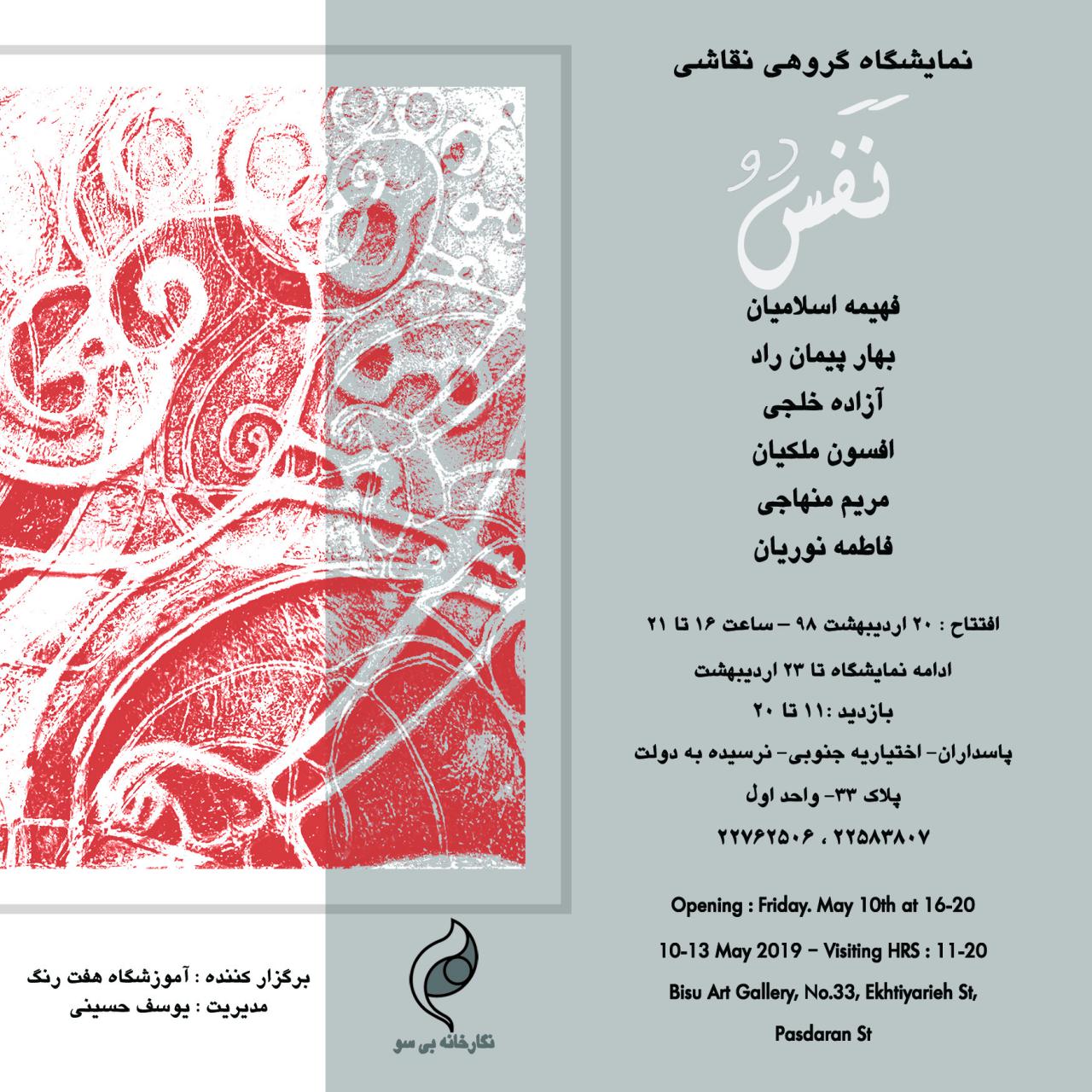 علاقمندان جهت بازديد از نمايشگاه "نفس دو" مي توانند تا 23 اريبهشت ماه از ساعت 11 الي 20 به نگارخانه بي سو واقع در پاسداران، اختياريه جنوبي، نرسيده به دولت، پلاک 33، واحد اول مراجعه نمايند.