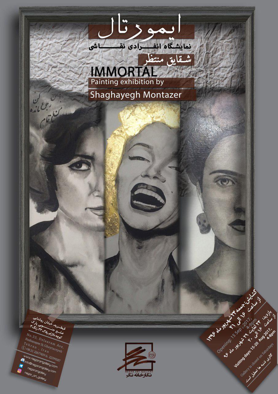 به گزارش گالري آنلاين، از روز جمعه بيست و چهارم شهريورماه آثار نقاشي شقايق منتظر تحت عنوان "ايمورتال" در گالري نگر به نمايش درآمد.