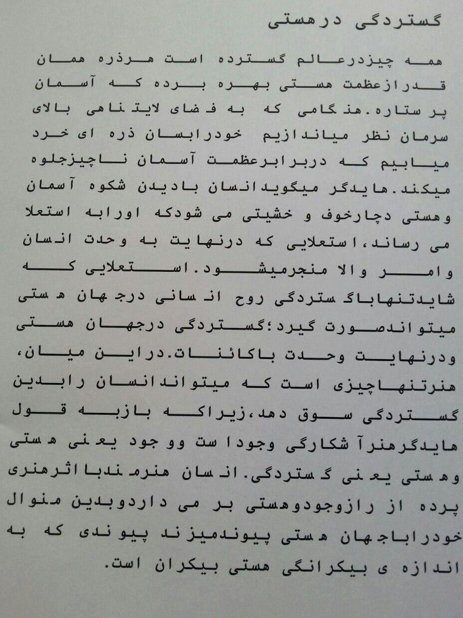 بيشتر تحت تاثير عرفان اسلامي و نظرياتي که در ارتباط با کائنات، خداوند و آفرينش هستيست، بوده ام. در واقع بحث گستردگي در کائنات همان بحث آفرينش است و اين آفرينش همان گستردگي يک ذره است. مقصود اين است که همه ي ما يکي هستيم و آن کل هم خداوند است.