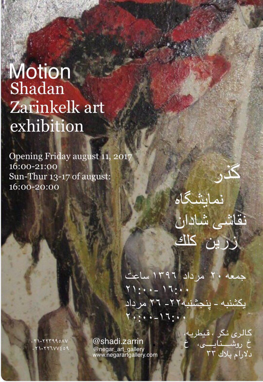به گزارش گالري آنلاين ، گالري نگر از روز جمعه بيستم مردادماه ميزبان نمايشگاه نقاشي هاي شادان زرين کلک تحت عنوان "گذر" شده است.