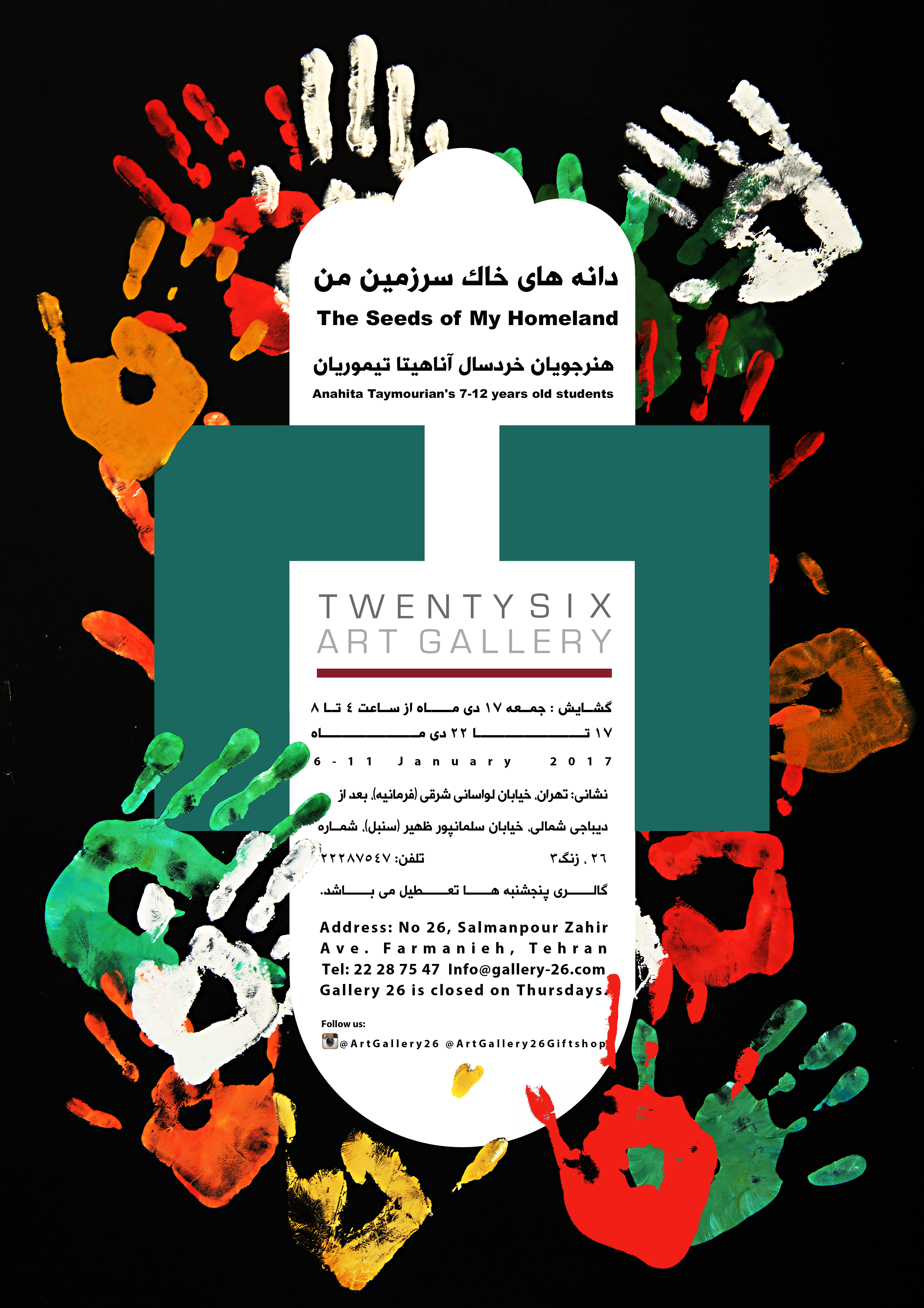 هنرجويان خردسال آناهيتا تيموريان نمايشگاه خود را تحت عنوان " دانه هاي خاک سرزمين من" از روز جمعه هفدهم دي ماه 95 در گالري 26 برگزار کردند.