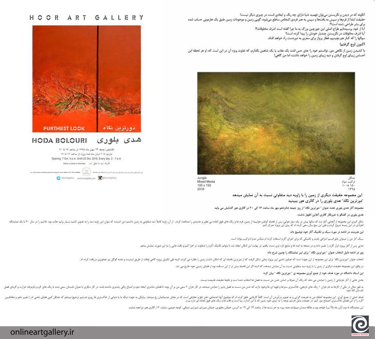 گزارش تصويري نمايشگاه نقاشي هاي هدي بلوري با عنوان “دورترين نگاه” در گالري هوراز گالری آنلاین / اکتبر 9, 2016 اخبار مرتبط: اين مجموعه حقيقت ديگري از زمين را با زاويه ديد متفاوتي نسبت به آن نمايش ميدهد/"دورترين نگاه" هدي بلوري را در گالري هور ببينيد